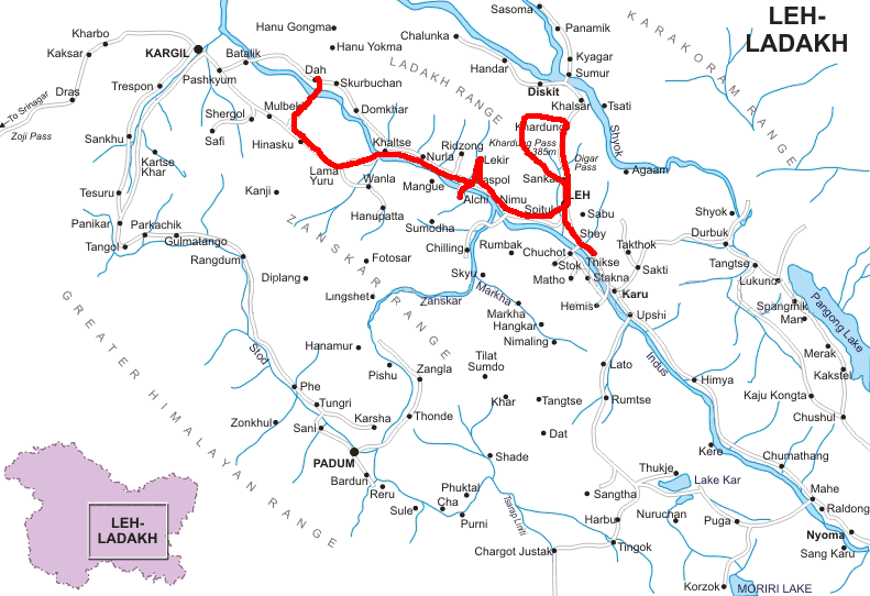 Dag 5: LEH - LIKIR - ALCHIStart van de jeep safari van Leh over Likir naar Alchi. Op de oude karavaanroute tussen Basgo en Khalse bevindt zich in Likir een oud klooster dat tot de Gelupa orde behoort. Onderweg wordt ook nog het Basgo kasteel bezocht. In Alchi staat het enige klooster van Ladakh dat niet op een hoogte is gebouwd. Overnachting in kampen. Dag 6: ALCHI - RIDZUNG - LAMAYURUTransfer van Alchi naar Ridzung waar het enige nonnenklooster in Ladakh bezocht wordt. Vervolgens wordt er verder gereden naar het kloostercomplex van Lamayuru. Dag 7: LAMAYURU - BIAMARit van Lamayuru naar Biama. Overnachting in kampen. Dag 8: BIAMA - DAH - LEHRit van Biama naar Dah en vervolgens terug naar Leh.